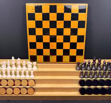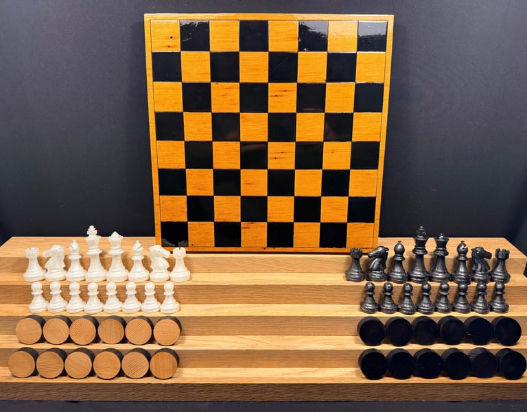 This new chess/checkers set is custom made including the chess pieces! Game board and checker pieces are made from a old fir stair tread!
